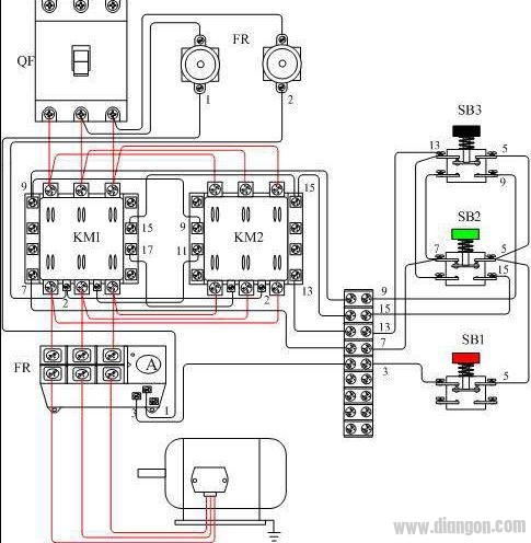 2、按下正向启动按钮SB3,KM1通电吸合并自锁,主触头闭合接通电动机,电动机这时的相序是L1、L2、L3,即正向运行。