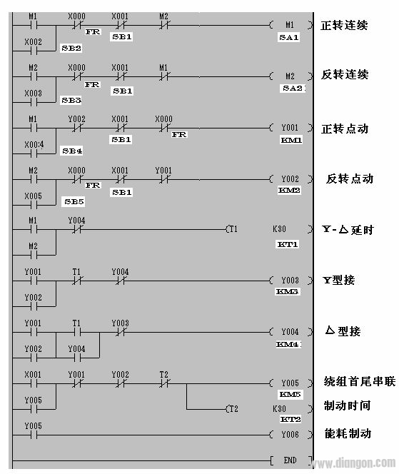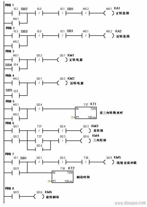 大功率的电动机一般使用星三角启动的控制方式,以减少对电网及设备的冲击;为了提高工效,停车时采用能耗制动的方式以利于设备的利用率;本电路的控制要求如下: 1、双向启动均采用星三角减压方式; 2、正、反转均设有点动控制功能; 3、停车设有能耗制动; 4、停车时先将电动机绕组首尾串联,然后进行制动,制动时间由时间继电器控制; 5、点动操作时电动机只能作星接运行,能耗制动不起作用。 6、为了方便,本控制也进行了下西门子、三菱plc程序的设计。 下图为继电器-接触器控制电路图