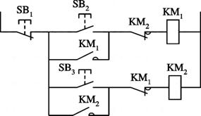 图2所示控制线路的工作过程是:当电动机M停转时,如要M正转,则按下SB2,其常闭触头先打开,其常开触头后闭合,KM1线圈得电,其常闭辅助触头先断开,其常开主触头后闭合,M正向启动运转,常开辅助触头闭合自保; 当M正转时,如要M反转,则按下SB3,其常闭触头先打开,KM1线圈失电,M的定子切断正序电源,其常开触头后闭合,在KM1常闭触头复位前提下,KM2线圈得电自保,M反转; M反转变为正转与正转变为反转类似。此控制线路采用复合按钮SB2、SB3与接触器KM1、KM2联合控制,可避免由于KM1或KM2的常闭辅助触头烧结时而造成的电源短路。