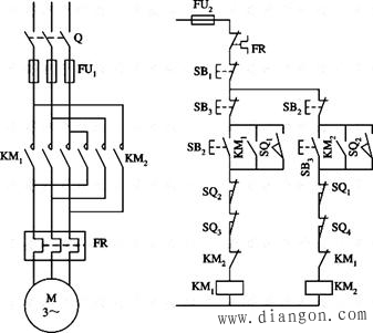 图4所示为往复自动循环的控制电路,其工作过程是:合上Q,按下SB2,KM1线圈得电自锁,M正转,驱动运动部件前进,当前进到位,撞块B压下SQ2,其常闭触头断开,KM1线圈断电,M切断正序电源,但SQ2常开触头闭合,又使KM2得电,M反转,运动部件后退,当后退到位时,撞块A压下SQ1使KM2断电,KM1通电,M由反转变为正转,如此周而复始地自动往复工作。按下SB1时,M停转。若换向用行程开关SQ1、SQ2失灵,则由限位开关SQ3、SQ4的常闭触头切断M的电源,避免运动部件因超出极限位置而发生事故。