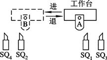 图3所示为机床工作台往返运动的示意图。行程开关SQ1(反向转正向)、SQ2(正向转反向)分别固定安装在床身上,反映循环的两端点,撞块A、B固定在工作台上,随着运动部件的移动可压下行程开关SQ1、SQ2,使其触头动作,并使电动机正反向运转。