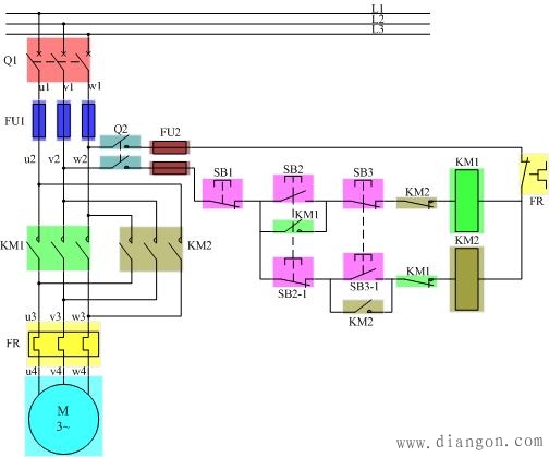 该线路使用复合按钮实现完整的电动机正反转控制线路,是自锁、互锁、电机反转等各知识点的综合应用,也是需要记忆的典型控制线路。