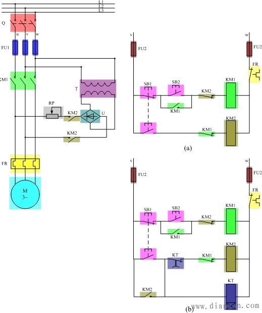 图(a)所示的是一种手动控制的简单能耗制动线路,要停车时按下SB1不放,KM2得电,单相桥式整流电路产生直流电流,流入电动机定子,产生制动力矩,完成能耗制动,制动完毕后在松开SB1。图(b)所示的是一种可以实现自动控制的能耗制动线路,可简化操作。制动时,按下SB1,直流电源接通,开始能耗制动,KT延时时间满后,KM2断电,最终完成制动。