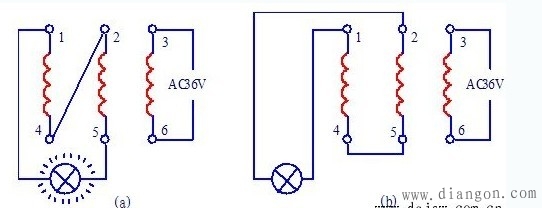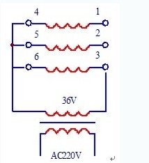 此法也可用一只交流电压表来进行。把3、6两线头接于变压器的输出电源线上,用交流电压测量3、2线头与3、1线头之间的电压U32、U31,若 U32≈U31> U36,则线头1、2、3(或线头4、5、6)同为起头或完头;若U32≈U31< U36,则表示3、6两线头接反了,对调3、6线头即可;同相,若U32>U36,而U31<U36,则表示1、4两线头反了,调换1、4两线头即可。