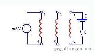 采用上图b的接线方式,首先确定电源正端连接绕组的端子为头(如3),用mA电流表或mV电压表连接于任一绕组的两端,当开关K接通瞬间,观察电流/电压表指针的摆动方向,若摆动方向是正方向(往数值大方向),说明连接电流/电压表红表笔一端的绕组端与电源正端所接绕组端同为头(或尾,或称为同名端)。再依次连接另一绕组,确定绕组的头、尾。