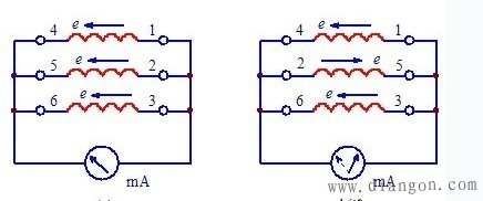 转动转子,如指针表不动,无电流指示(见下图a),说明绕组的头、尾接法是正确的。即1、2、3三相绕组的3个头是连接在一起的(4、5、6三相绕组的尾也是连接正确的);如果有电流表有电流指示(见下图b),说明连接错误,对调后再试。