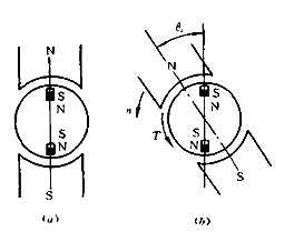 图1(a)中电机转子是一个硬磁材料的实心转子,大小不变的定子磁通势(或磁力线、或磁通.方向部―祥)在空间固定方间,转子处于恒定磁化状态。转子上的磁分子沿定子磁通势方问排列,转子总磁通势F与定子磁通φ方向―致,转子受转矩T=0。若定子磁通势逆时针方向在空间旋转,如图1(b)所示,转子处于旋转磁化状态.其上的磁分子都不停地改变方向,以使其磁通势的方向与定子旋转磁通势的方向一致,但是磁分子旋转时彼此甚大的摩擦力,使得它们不能即时跟上定子旋转磁通势的速度,而始终落后一个空间角度θC,这就是转子磁通势F与定子磁通φ的空间夹角,称作磁滞角。旋转磁化时由于磁滞角存在,转子受转矩TC≠0,是逆时针方向,称为磁滞转矩。磁滞式同步电动机起动时,转子之所以能随定子旋转磁通势旋转并达到同步转速n,其原因就在于有磁滞转矩。磁滞式同步电动机中,磁滞角θC的大小只取决于硬磁材料的磁化特性,与旋转磁通势的转速无关。当φ一定时,在0~n0范围内,θC与TC又都为常数。磁滞式同步电动机可以自行起动,而且起动转矩较大,这是它的优点。当转子转速到达n0同步运行以后,旋转磁通势与转子之间无相对运动,转子也从旋转磁化变为恒定磁化,即成了个永久磁铁。带的负载大小可以从0到TL;定子磁通势与转子磁通势夹角θ相应从0到θC。