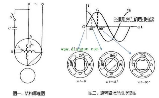 电容分相电动机的转子绕组是浇筑成型的鼠笼式,定子上饶有2组空间上相差90°的启动绕组B和工作绕组A,从而获得电角度ω为90°的两相交变电流,保证旋转磁场的形成条件。(如图一所示)