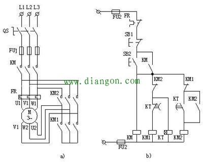 再看二次回路:SB1是停止按钮,SB2是启动按钮,当按下SB2时KM线圈得电吸合并自锁,同时时间继电器KT通过KM2的常闭触点得电,KM1线圈通过KM2的常闭触点时间继电器KT的延时释放触点得电,这时KM与KM1都吸合可电机通电形成星型接法启动,注意:是KM先于KM1吸合。KM1要承受很大的启动电流。当时间继电器KT延时结束后KT的延时常闭触电断开,延时常开闭合,KM1线圈失电释放KM1断开,KM2线圈通过KM1的常闭触电得电吸合并自锁。KM与KM2组成三角形运行回路,电路启动完成。KM1与KM2的常闭触点是互锁回路防止KM1与KM2同时吸合。这种接法简单,直接,易懂便于维修,但是KM1的启动电流很大,要用三个大电流的接触器。
