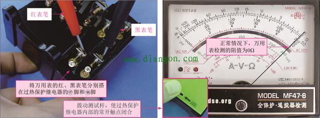 若要进一步对过热保护继电器进行检修时,可以拨动过热保护继电器的测试杆后,再次分别检测常闭触点和常开触点。