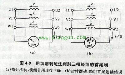 将三相绕组接成星形,从一相绕组接入36V交流电源,在另外两相绕组的一端接入置于10V交流电压挡的万用表,按图4-8(a)和(b)所示各接一次。 通电后,观察万用表指针的摆动情况。若两次万用表指针均不动,则说明图中所示的首尾端正确;若两次万用表指针都偏转,则说明两次均未接电源的那一相的首尾接反 ;若只有一次指针偏转,另一次指针不动,则说明指针不动的那一次中接电源的那一相首尾接反。