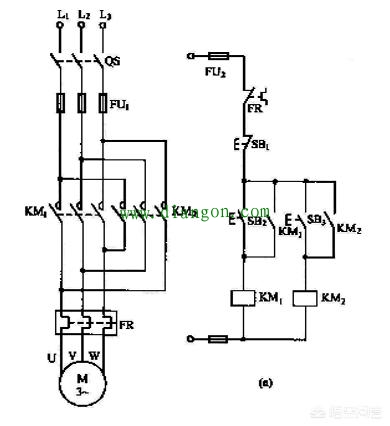 图中的QS是闸刀开关,FU1是主电路保险丝,FU2是控制电路保险丝,FR是热继电保护器。