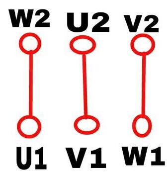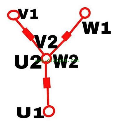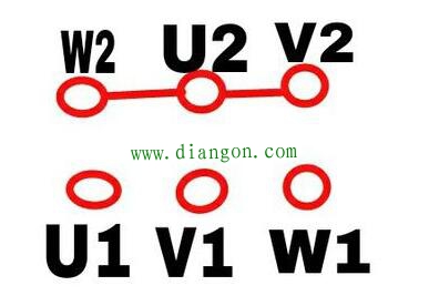 星形启动优点就是启动电流小,但是缺点就是功率低,适合电动机空转或者低载重物,也就是说星形启动电流小,但是劲也小很容易理解吧,接线方式就是UI,V1,W1这三个接线柱接A,B,C三相火线,U2,V2,W2这三个接线柱要直接连接,我们在电动机接线盒内看到是用两个铜牌横向联通,这六个接线柱就是三个绕阻的头尾部,如下图:
