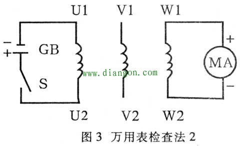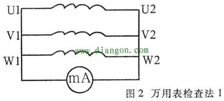 ①万用表置mA档,按图2接线。假设一端接线为头(U1、Vl、W1),另一端接线为尾(U2、V2、W2)。