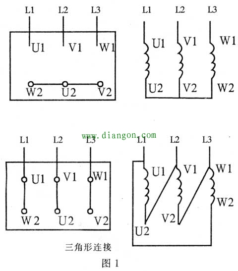 检修或重绕三相异步电动机三相绕组的六条引出线,头、尾必须分清,否则在接线盒内无法正确接线。按规定六条引出线的头、尾分别用U1、V1、W1、U2、V2、W2标注标号(旧标号为D1,D4,D2,D5,D3,D6)。其中U1、U2表示**相绕组的头、尾端;V1、V2表示**相绕组的头、尾端;W1、W2表示第三相绕组的头、尾端。不同字母表示不同相别,相同数字表示同为头或尾。检修电动机时,如果六条引线上标号完整,只有接线盒内接线板损坏,可按电动机铭牌上规定的接法更换接线板,正确接线即可。电动机接线方法分为星形(Y)、三角形(△)两种连接方法。如图l所示。如果六条引线上的标号已被破坏或重绕电动机绕组后,就必须先确定六条引线的头、尾端进行标号,然后再按规定接到接线板上。