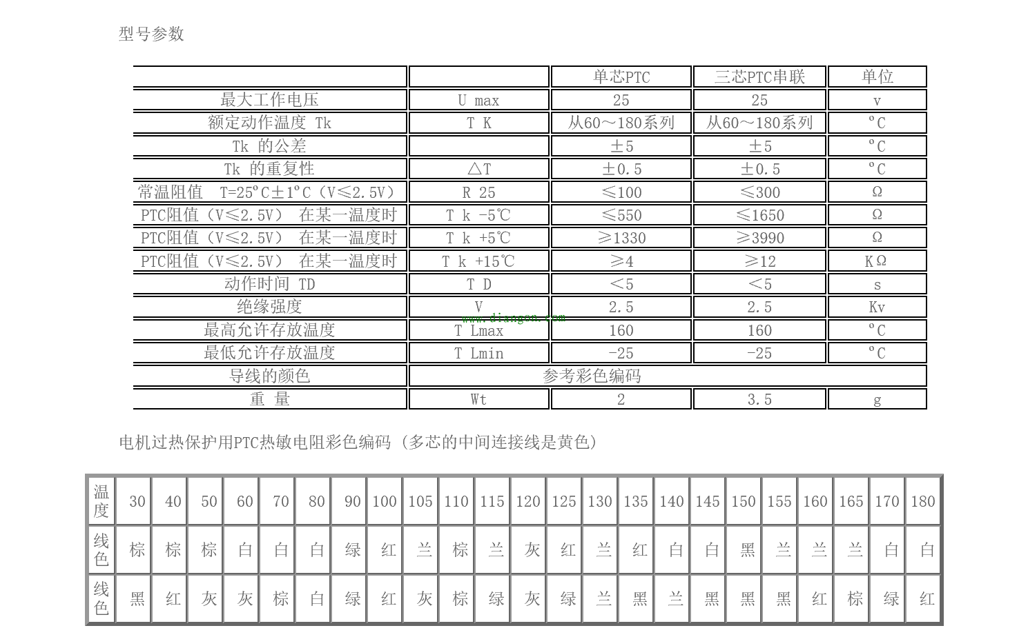 根据行业规定,采用PTC电阻的线色来区分不同温度值,如下表所示: