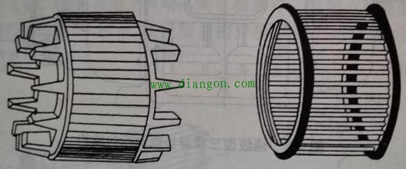 鼠笼型电机转子绕组是自己短路的绕组,在转子在每个槽中放有一根导体,导体比铁芯长,在铁芯两端用两个端环将导体短接,形成短路绕组。若将铁芯去掉,剩下的绕组形状似松鼠笼子,故称鼠笼式绕组。