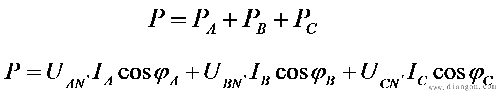 在三相电路中,三相负载吸收的有功功率等于各相有功功率之和,即