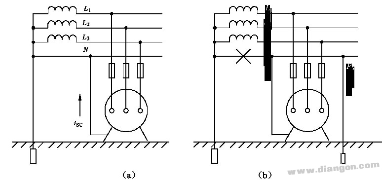 电气设备在使用中,若设备绝缘损坏或击穿而造成外壳带电,人体触及外壳时有触电的可能。为此,电气设备必须与大地进行可靠的电气连接,即接地保护,使人体免受触电的危害。 (1)保护接地的概念及原理 ①保护接地的概念 为保证其正常工作而进行的接地;保护接地是指为保证人身安全,防止人体接触设备外露部分而触电的一种接地形式。在中性点不接地系统中,设备外露部分(金属外壳或金属构架)必须与大地进行可靠电气连接,即保护接地。三相发电机或变压器的中性点接地属于工作接地,接地装置由接地体和接地线组成,埋入地下直接与大地接触的金属导体,称为接地体,连接接地体和电气设备接地螺栓的金属导体称为接地线。接地体的对地电阻和接地线电阻的总和,称为接地装置的接地电阻。 ②保护接地的原理 在中性点不接地系统中,设备外壳不接地且意外带电,外壳与大地间存在电压,人体触及外壳,人体将有电容电流流过。这样,人体就遭受触电危害。如果将外壳接地,人体与接地体相当于电阻并联,流过每一通路的电流值将与其电阻的大小成反比。人体电阻比接地体电阻大得多,人体电阻通常为600~1000欧,接地电阻通常小于4Q,流过人体的电流很小,这样就完全能保证人体的安全。 保护接地适用于中性点不接地的低压电网。在不接地电网中,由于单相对地电流较小,利用保护接地可使人体避免发生触电事故。但在中性点接地电网中,由于单相对地电流较大,保护接地就不能完全避免人体触电的危险,而要采用保护接零。 (2)保护接零的概念及原理 ①保护接零的概念 保护接零是指在电源中性点接地的系统中,将设备需要接地的外露部分与电源中性线直接连接,相当于设各外露部分与大地进行了电气连接。 ②保护接零的工作原理 当设备正常工作时,外露部分不带电,人体触及外壳相当于触及零线,无危险,如图(a)所示。采用保护接零时,应注意不宜将保护接地和保护接零混用,而且中性点工作接地必须可靠。  图保护接零工作原理电路 ③重复接地 在电源中性线做了工作接地的系统中,为确保保护接零的可靠,还需相隔一定距离将中性线或接地线重新接地,称为重复接地。 从图 (a)可以看出,一旦中性线断线,设备外露部分带电,人体触及同样会有触电的可能。而在重复接地的系统中,如图 (b)所示,即使出现中性线断线,但外露部分因重复接地而使其对地电压大大下降,对人体的危害也大大下降。不过应尽量避免中性线或接地线出现断线的现象。 (3)漏电保护 漏电保护为近年来推广采用的一种新的防止触电的保护装置。在电气设备中发生漏电或接地故障而人体尚未触及时,漏电保护装置已切断电源;在人体已触及带电体时,漏电保护器能在非常短的时间内切断电源,减轻对人体的危害。漏电保护器的种类很多,目前应用较多的是晶体管放大式漏电保护器。