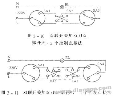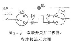 如图9所示,节省一根控制导线的两地控制开关接法。当两个地点之间距离较远时,耗用的导线就要很多,按图9所示的方法接上4只二极管,就可节省两个双联开零短路。关之间的一根导线。二级管耐压要大于400V,正向电流大于负载电流即可。采用图9所示方法接线,电灯要比额定功率时稍暗,但耗电量却减少了一半,同时灯泡的寿命也大大延长,很适合楼梯、走廊使用。当控制地点超过两个时,可在两个双联开关中间加装双刀双掷开关,如图10所示是3个控制地点的接线方法。如果需要在4个地点控制,再增加一个双刀双掷开关,如图11所示。其余以此类推。
