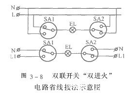 难。此时可将图7所示接线方 法改为图8所示的方法接线,这时只需一根控制线。这就是老电工常称之谓“双进火”电路。这种接线方法最大的缺点是,当照明灯不亮时,有可能开关都接在相线上,即灯的两端都可能接到相线上。如检修人员不知道,稍为粗心大意,此时接触照明灯,就有触电的危险。因此,使用时应注