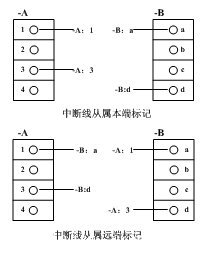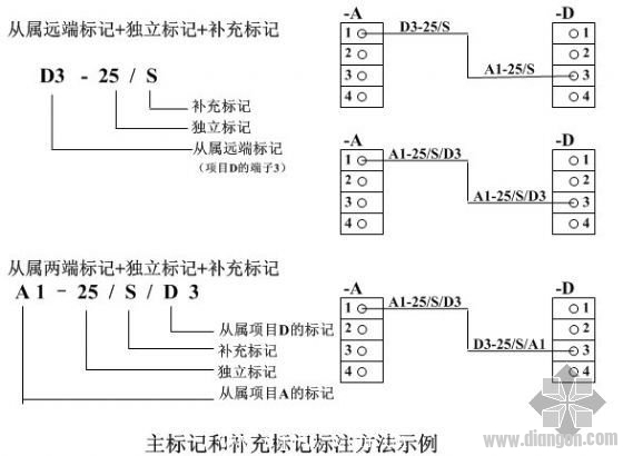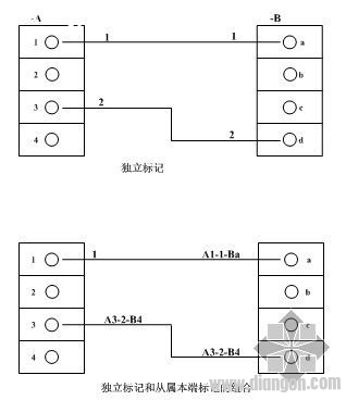 5、组合标记:从属标记和独立标记一起使用的标记系统。从属本端标记和独立标记一起使用的组合标记,两根导线分别标记为A1-1-Ba/A3-2-Bd。