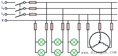 图1所示是三相四线制电路,设线电压为。电灯负载(,单相负载)比较均匀地分配在各相之中,接在相线与中性线之间;三相电动机接在三根相线上。