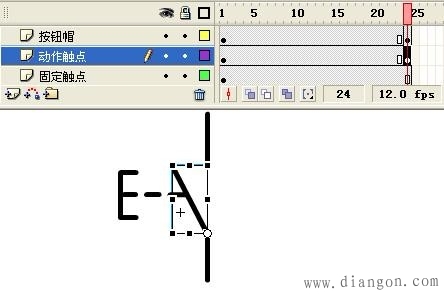 分别在“按钮帽”图层、“动作触点”图层的第24帧点击鼠标右键选择“插入关键帧”,在“固定触点”图层的24帧“插入帧”,然后点击图层的第24帧,使“动作触点”元件处在任意变形的状态,见图4。这时将鼠标移动至“动作触点”元件的左上角位置见图5(a),使鼠标变为旋转的箭头,然后按住鼠标左键使“动作触点”元件旋转至垂直位置,见图5(b);接着点击“按钮帽”图层的第24帧,用鼠标拖动“按钮帽”元件至图5(c)所示位置。