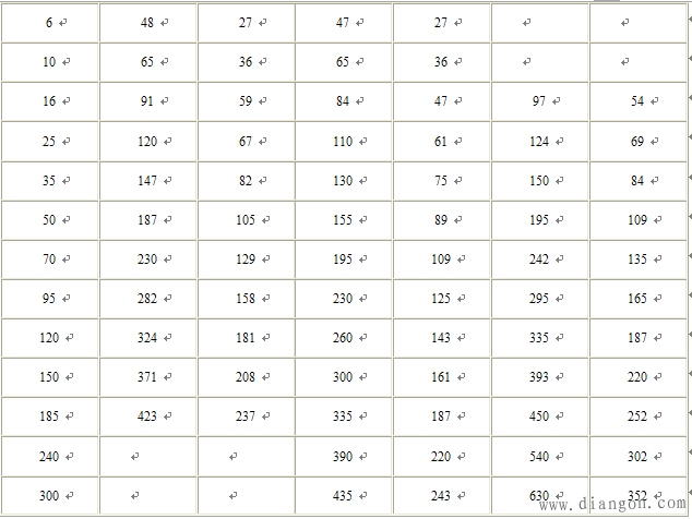 电线电缆规格选用参考表 说明: 1.同一规格铝芯导线载流量约为铜芯的0.7倍,选用铝芯导线可比铜芯导线大一个规格,交联聚乙烯绝缘可选用小一档规格,耐火电线电缆则应选较大规格。 2.本表计算容量是以三相380V、Cosφ=0.85为基准,若单相220V、Cosφ=0.85,容量则应×1/3。 3.当环境温度较高或采用明敷方式等,其安全载流量都会下降,此时应选用较大规格;当用于 繁起动电机时,应选用大2~3个规格。 4.本表聚氯乙烯绝缘电线按单根架空敷设方式计算,若为穿管或多根敷设,则应选用大2~3个规格。 5 以上数据仅供参考,最终设计和确定电缆的型号和规格应参照有关专业资料或电工手册。 |