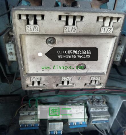 事发当日的白天,一名建筑工人不慎将装有该接触器的控制箱碰落,致使该交流接触器陶质消弧罩破碎(见图二),因害怕受到处罚,该工人将消弧罩完全拆下并丢弃(水泵为晚上使用故没人发觉)。