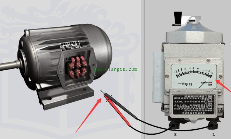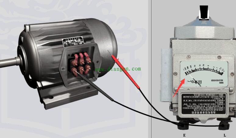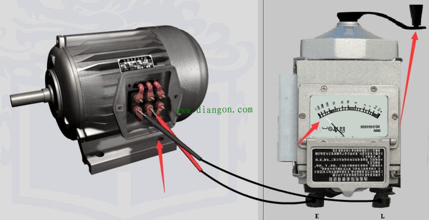 5.第一步:测三相输出端与外壳的绝缘电阻,E接触电机外壳,L分别接触UVW三个接线端,以每分钟120转左右的速度摇动手柄,待指针稳定在无穷大附近时即为绝缘良好。