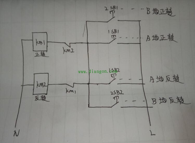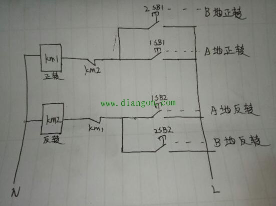 使用人员反应半天前使用B地手动按钮只能正转不能反转,当时也没有太在意,能用A地按钮启动就行。 可当天下午就出现问题了,一起动接触器就跳100A的空开。这就让我们有点不知所错了,都没有问题,为什么会跳。再一次偶然的机会不管按A地正转,B地反转按钮。发现都是正转接触器得电。这是才恍然大悟,原来是早晨使用人员暴露的问题,B地使用线路短路造成的,如图所示: