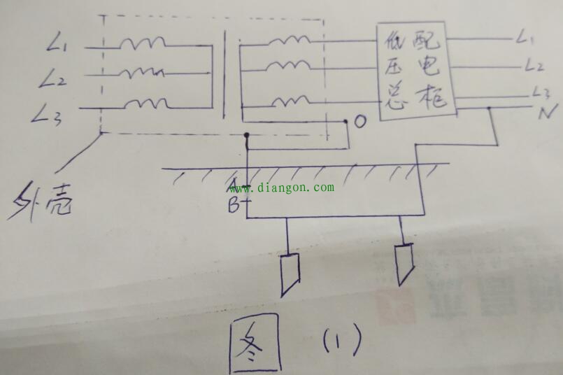 该厂低压侧配电方式为三相四线制,中性点直接接地。所有电气设备均采取了保护接地措施。按正常情况,三相负荷不平衡,不会造成三相相电压严重不相等。后检查高压侧是10千伏进户,变电所的接地网上有两根引上线,(70平方的钢芯绞线2根),已使用多年。一根引上线接至变压器低压侧的零线端子及变压器外壳,另一根引上线引至低压总配电柜与5O平方两根塑料铜芯线连接后通过架空线引入车间。如图1所示。经过测量,变压器零线端子对地电压为80伏,断电后检查相线对地未短路,故障疑点转移到接地网上。用万用表测量接地网的两根引上线之间的电阻,发现开路,电阻极大。正常情况应该最大不超过10欧姆,由此判断:接地网与引上线之间断开了。开挖之后,果然在AB段之间一个焊点(钢绞线与扁铁联结处)断开了。