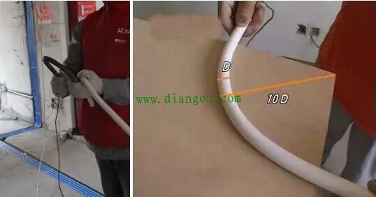 4、弯管:冷弯管要用弯管工具,弧度应该是线管直径的6倍,先排管,后用钢丝穿过,便于以后线路升级、维修。