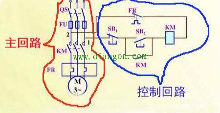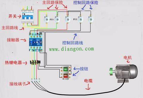 但接触器怎么才能吸合呢?www.diangon.com就需要控制回路控制接触器,控制回路给接触器线圈通电,接触器就吸合,断电就释放。控制电流通过控制保险,黑色控制线、按钮、热继电器辅助触点、接触器辅助触点、到接触器线圈,按下启动按钮,接触器线圈通电,吸合,主触点闭合,控制主回路接通。按下停止按钮,接触器线圈断电,释放,主触点断开,主回路断电。这就是主回路和控制回路的关系。