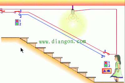 它的原理非常简单,只需比单控开关多一条线就可实现,主要由两个双控开关来组合实现。都是二选一开关,因此任何时刻,拨动任一开关,灯不是亮就是灭。当左边开关拨动是灯亮的时候,右边开关拨动必然是灯灭,反之亦然。好了,明白了开关的接法,接下来就看实物接法图。