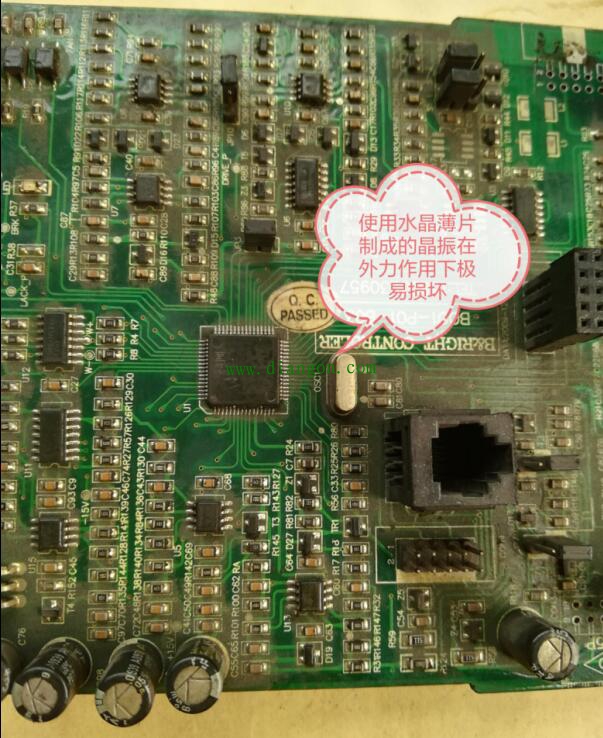 接手后,本人认为该板在物流过程中受到颠簸振动(物流、快递的操作想必大家都应该熟知),致使线路板上的元器件发生开焊、脱焊故障现象所致。可一番针对性的检测后,并未发现此类问题。无奈之下笔者只好从电源、复位、时钟所谓主控板三要素为出发点,进行维修。当检测到主控板DSP芯片外置时钟振荡部分时,发现其XLT1、XLT2两脚虽有直流电压,(https://www.diangon.com/独家原创 版权所有)但近一步测量中并未检出时钟频率,谨慎起见使用示波器测量两脚,同样未测出时钟振荡频率和波形!最终认定该故障原因为——物流运输过程中的抛摔、磕碰等剧烈的外力作用,造成此线路板上时钟振荡器件石英晶体振荡器(一般简称:晶振),出现“内伤”损坏所致!