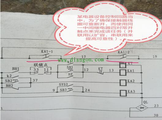 同理可知,在继电器、接触器触点容量因负载电流较大而出现损坏现象时,可以通过触点并联扩容的方式来加以克服。如下图所示,就是触点串并联使用的典范实例。