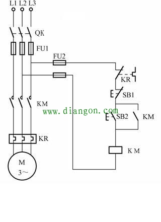 按下自复按钮开关SB2以后,接触器KM吸合。SB2复位以后,接触器KM通过自身的常开点持续吸合,这就是自锁。