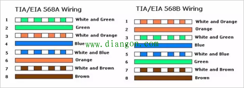 一端为:1橙白、2橙,3绿白、4蓝,5蓝白、6绿,7棕白、8棕(568B)