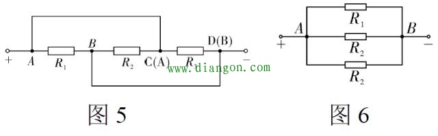 第二步合并节点。根据节点的特点,你标出的某几个节点有可能等效为同一节点,必须将属同一节点的字母(或符号)改为同一字母(或符号),如图5所示电路中点A与点C为同一节点,应改C为A,点B与点D为同一节点,应将D改写为B,也就是说图5所示电路实质上有两个节点A和B。