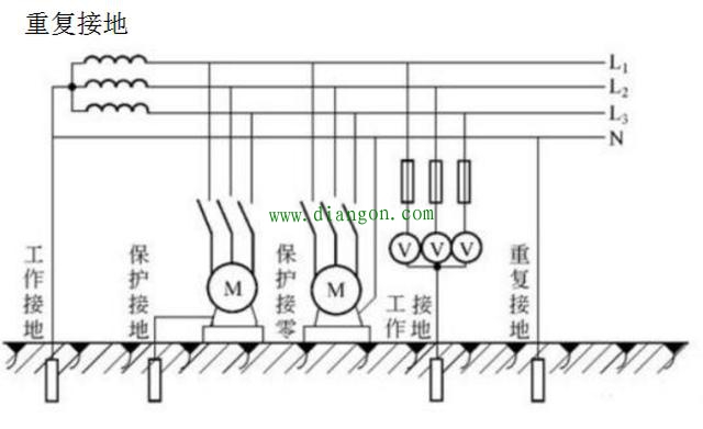 ③要求中性线必须重复接地,因为在中性线断开的情况下,接零设备外壳上都带有220V的对地电压,这是绝不允许的。