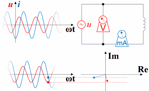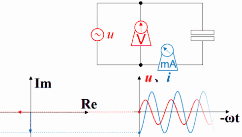 如果把波形画在矢量图右方,就是下面这种动画,但横坐标右方是过去存在的波形,指向过去,是-ωt。虽然波形反过来了,但电压的变化仍然超前于电流,电流的变化仍然滞后于电压。时间原点一直随着波形往右方移动,函数图中的纵坐标轴并未与横坐标交于原点,交点所代表的时间一直在增加。如果不注意,超前滞后的判断很容易出错。