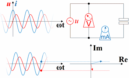 理解超前滞后这一概念用相量图是最好的,从测量数据来观察或者从静态波形上观察都不太直观而且容易出错。下图是电容的。电压的变化滞后于电流,电流的变化超前于电压。坐标系右方是未来,左方是过去。