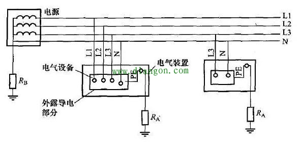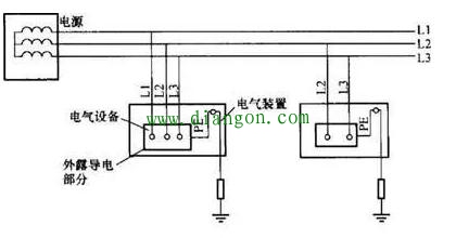 ①TN-C系统(三相四线制),该系统的中性线(N)和保护线(PE)是合一的,该线又称为保护中性线(PEN)线。(https://www.diangon.com版权所有)它的优点是节省了一条导线,但在三相 负载不平衡或保护中性线断开时会使所有用电设备的金属外壳都带上危险电压。在一般情况下,如保护装置和导线截面选择适当,TN-C系统是能够满足要求的 (见图3)。