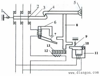 7、10――衔铁 8――杠杆 11――欠压脱扣器 12――电阻丝 13――双金属片