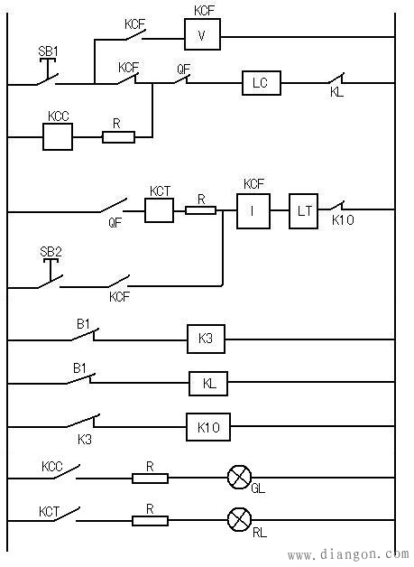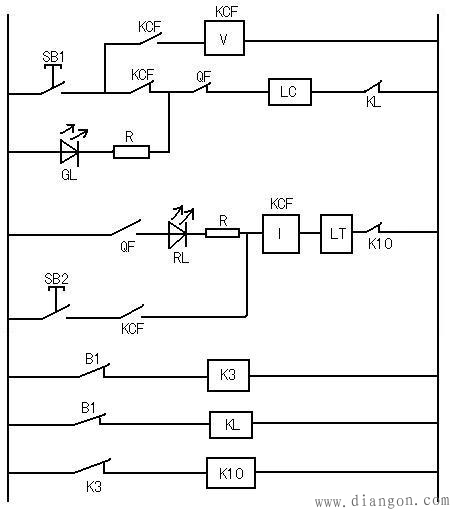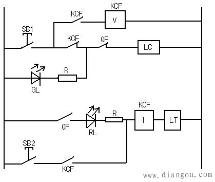 若此时由于故障,保护装置使断路器跳闸,则由于KCF(V)的保持作用,SB1回路经KCF辅助触点改道KCF(V)回路,不会再使LC得电,也就避免了断路器的再次合闸,从而避免了跳跃的发生。