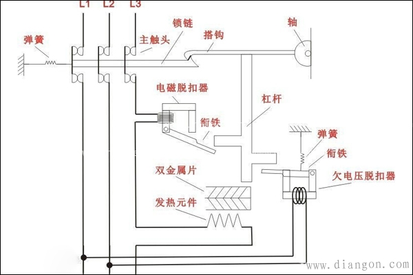 另外开关的脱扣机构是一套连杆装置。当主触点通过操作机构闭合后,就被锁钩锁在合闸的位置。如果电路中发生故障,则有关的脱扣器将产生作用使脱扣机构中的锁钩脱开,于是主触点在释放弹簧的作用下迅速分断。按照保护作用的不同,脱扣器可以分为过电流脱扣器及失压脱扣器等类型。