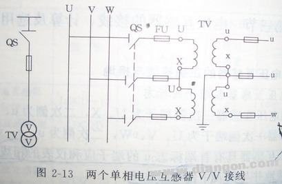 由两只单相电压互感器组成的V-V形接线时,其一次侧是不允许接地的,因为这相当于系统的一相直接接地。而应在二次中性点接地,如下图所示。