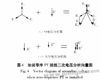 由以上分析可知,加装零序PT电压互感器接线(图2)与普通的电压互感器接线(图1)有如下异同: